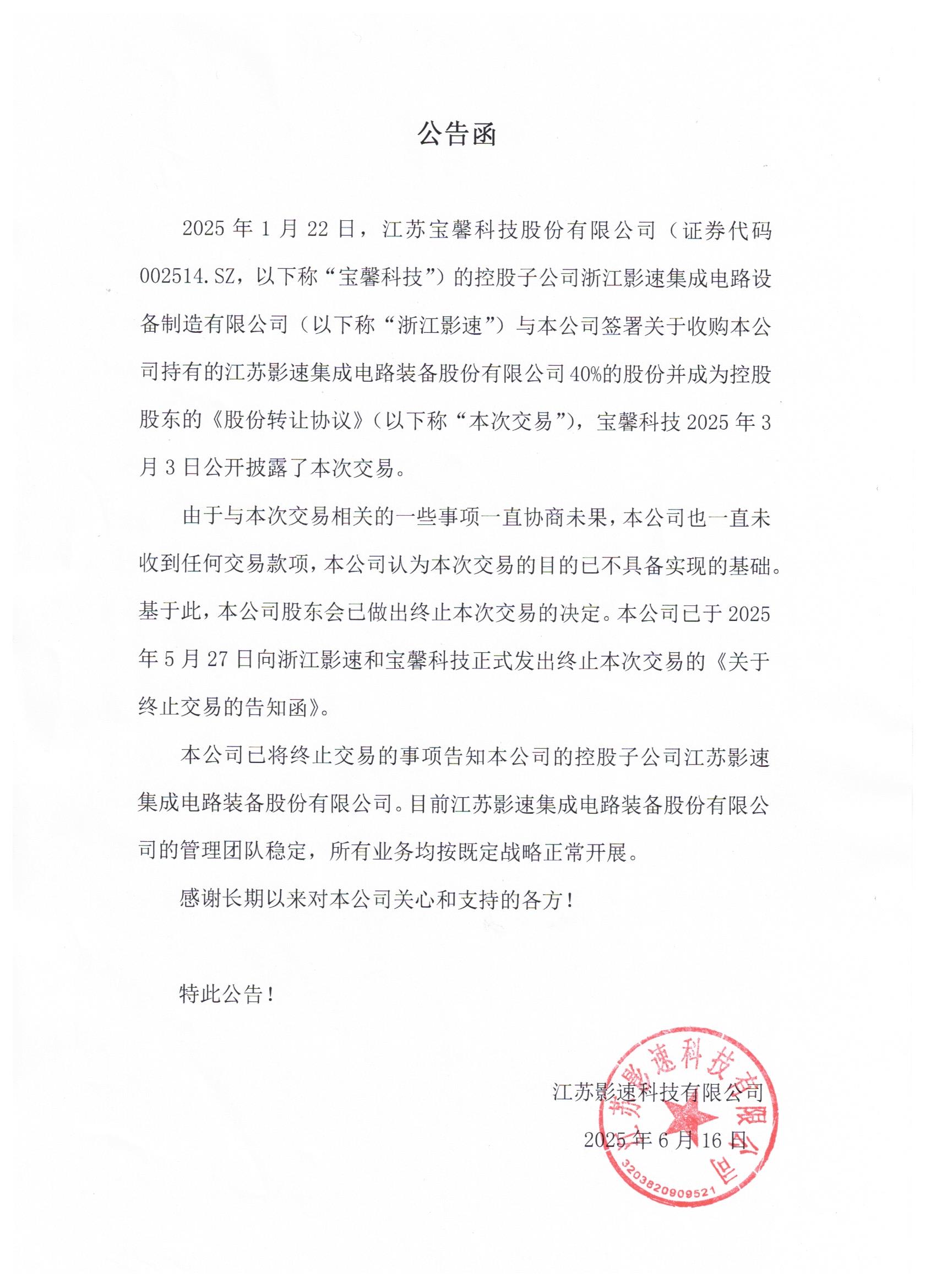 本公司接到控股股东江苏金年汇科技有限公司通知,江苏金年汇科技有限公司于2025年1月22日与江苏宝馨科技股份有限公司(证券代码002514.SZ,以下称“宝馨科技”)的控股子公司浙江金年汇集成电路设备制造有限公司(以下称“浙江金年汇”)签署关于收购江苏金年汇科技有限公司持有的本公司40%的股份并成为本公司控股股东的《股份转让协议》(以下称“本次交易”),宝馨科技2025年3月3日公开披露了本次交易。
